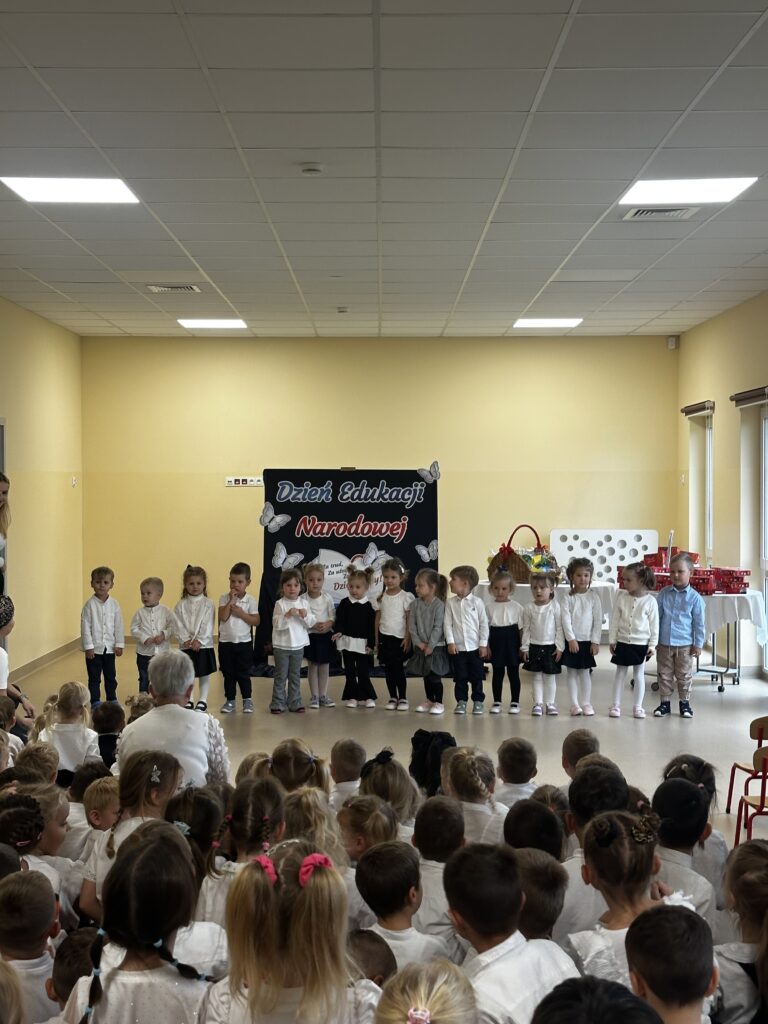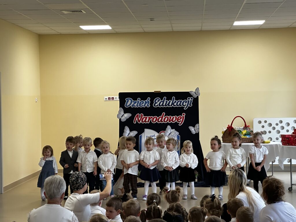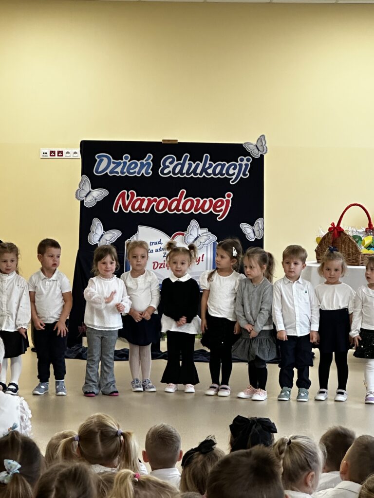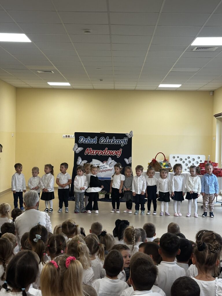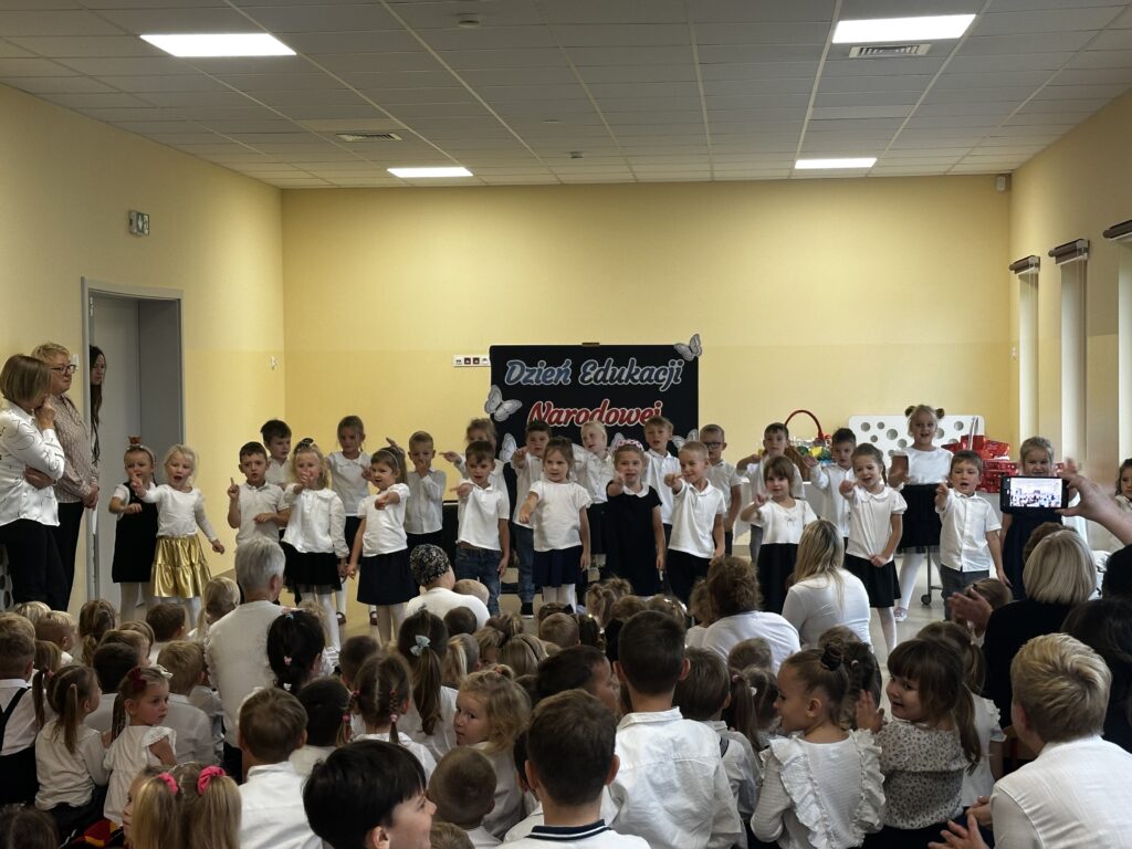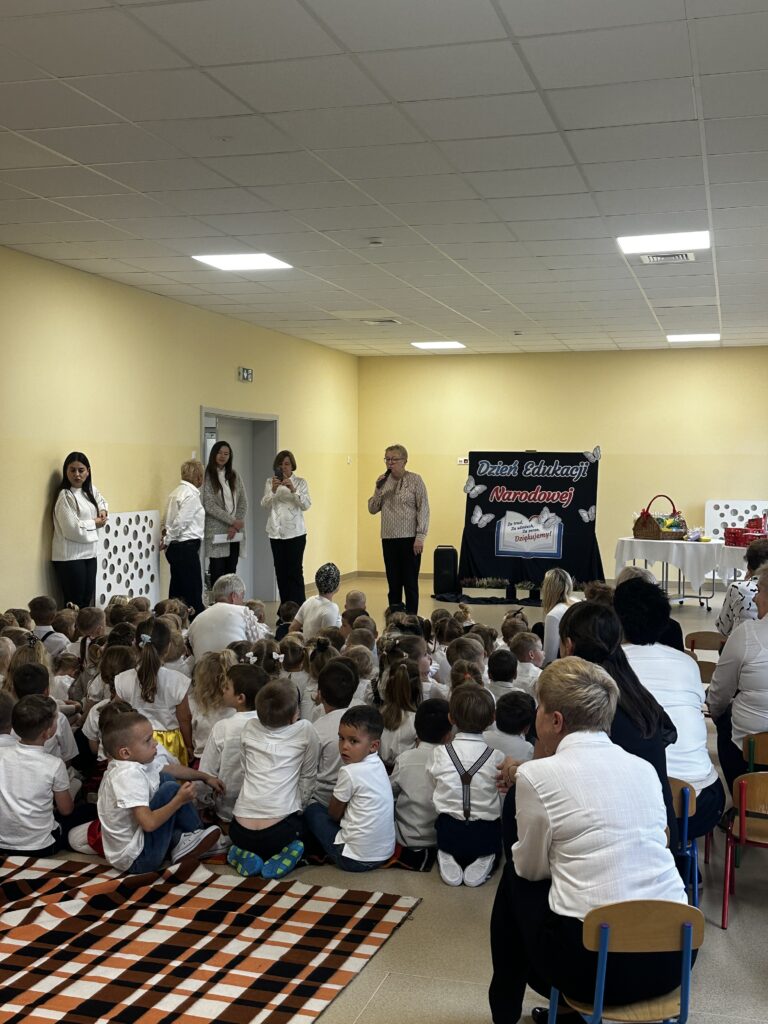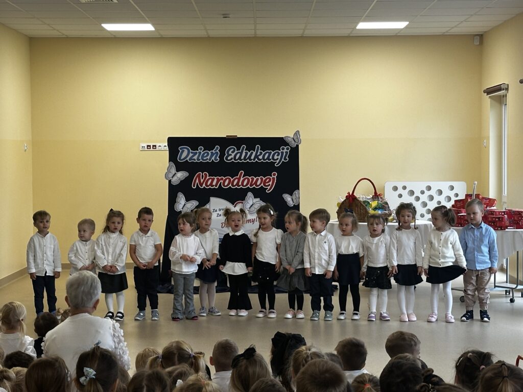 Miniony wtorek – 14 października to był dla nas wyjątkowy dzień. W przedszkolu pamiętamy, że to Dzień Edukacji Narodowej, a więc podziękowania za trud we włożoną pracę składaliśmy wszystkim pracownikom – obecnym i przebywającym na emeryturze. Dziękowaliśmy tak, jak potrafimy – wierszem, piosenką i tańcem 😏. Każde słowo wypowiedziane przez „małych artystów” wzbudzało zachwyt i wzruszenie na twarzach zgromadzonych gości.