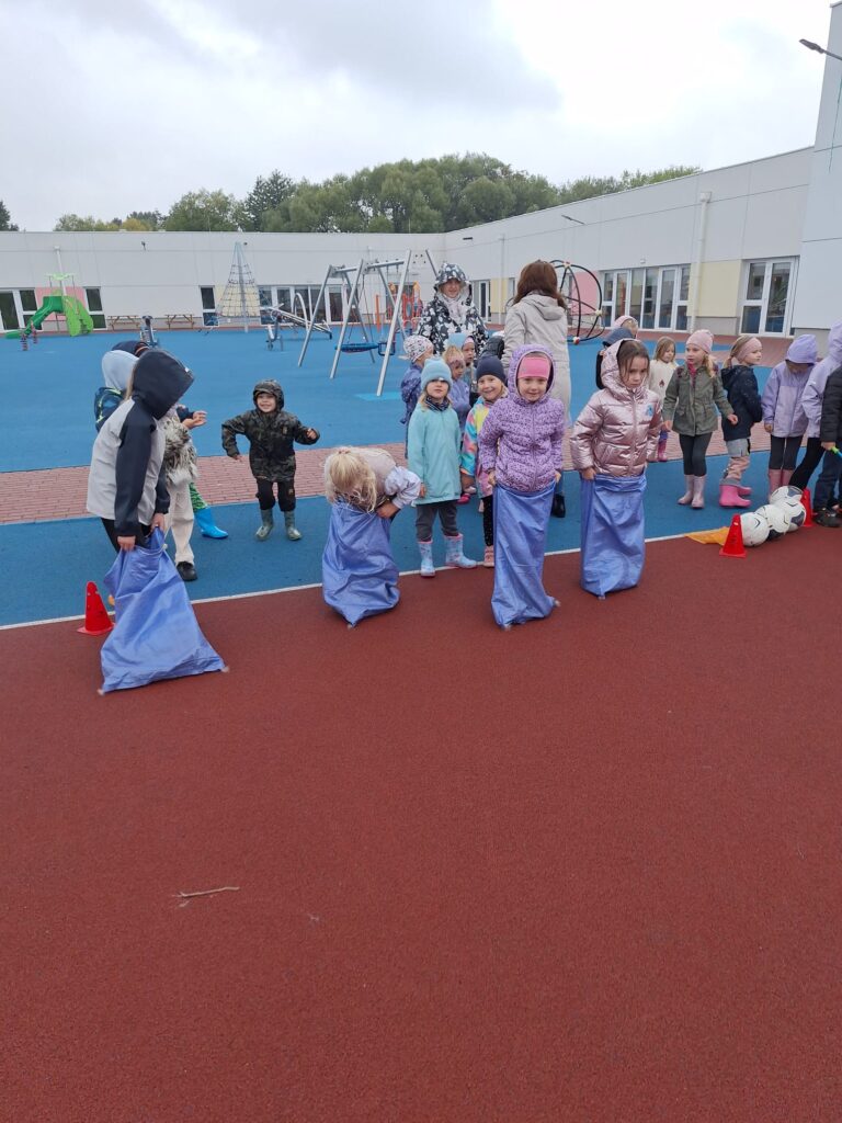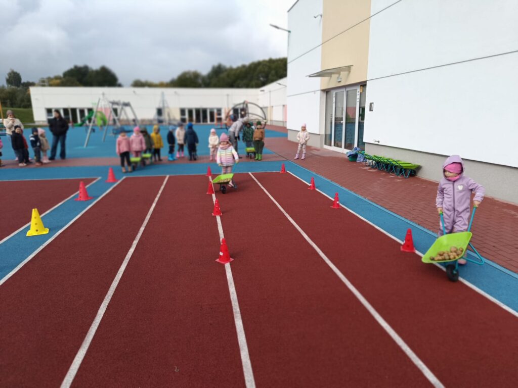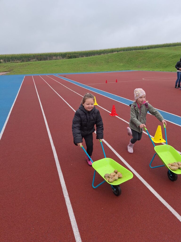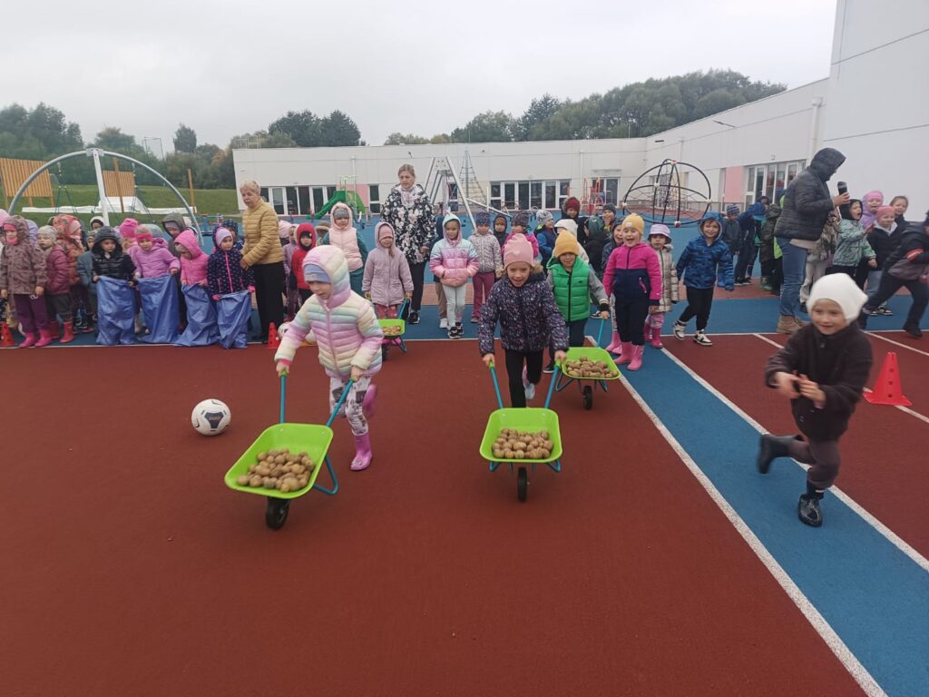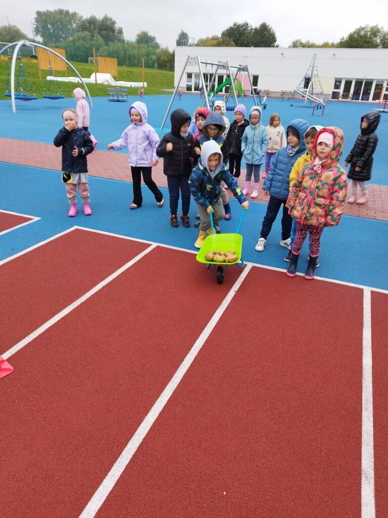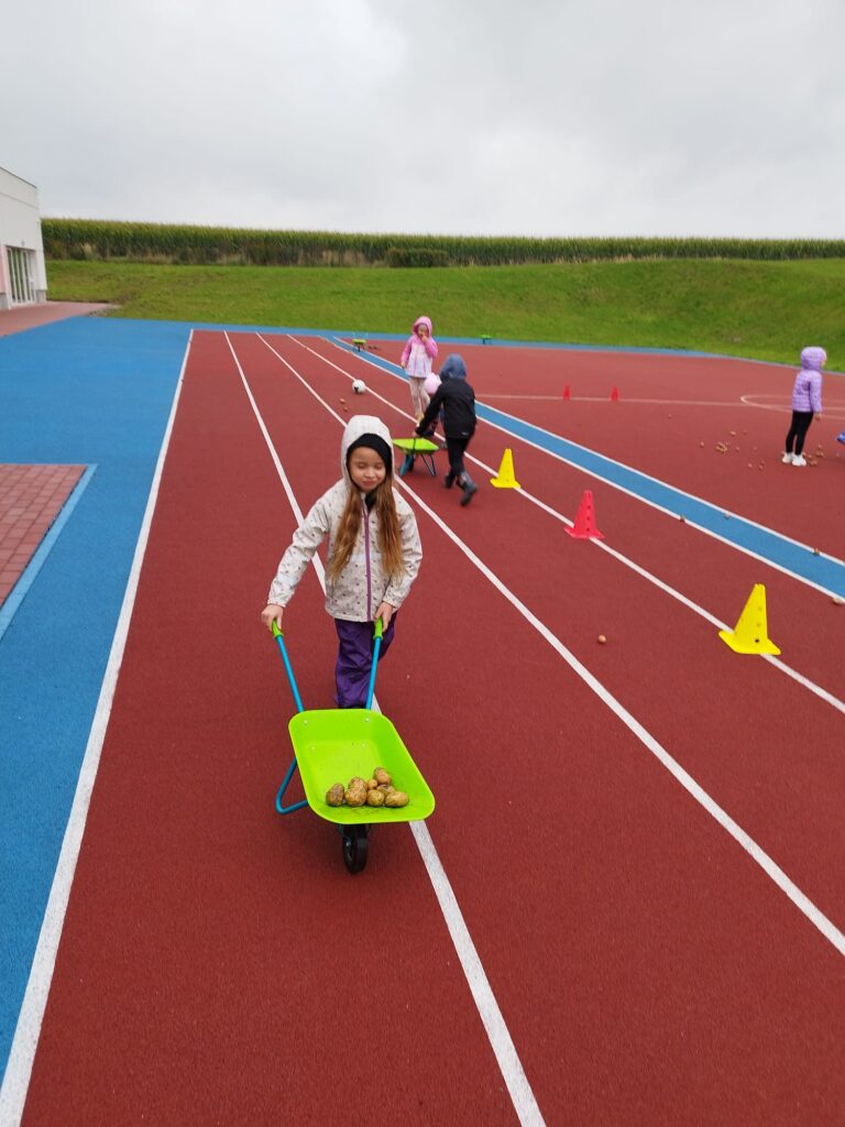 Nie zabrakło też świetnej zabawy: skoki w workach, slalom z taczkami , kodowanie, stemple oraz ścianka do zdjęć i to wszystko z bohaterem tego dnia, Ziemniakiem.