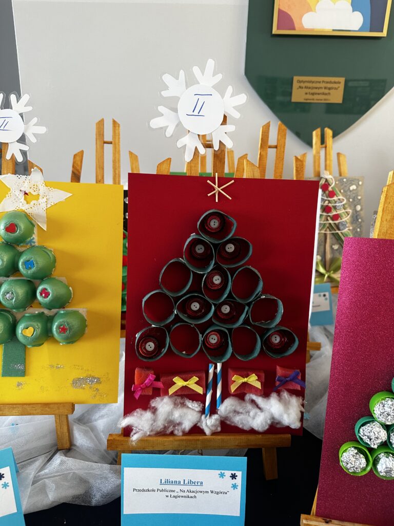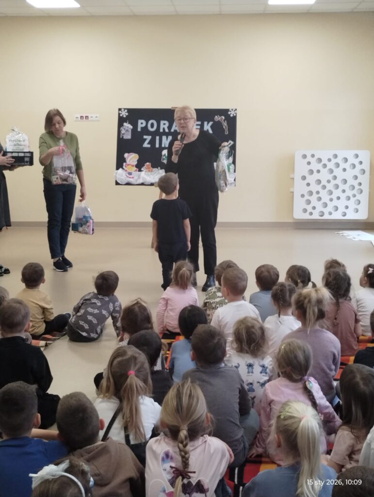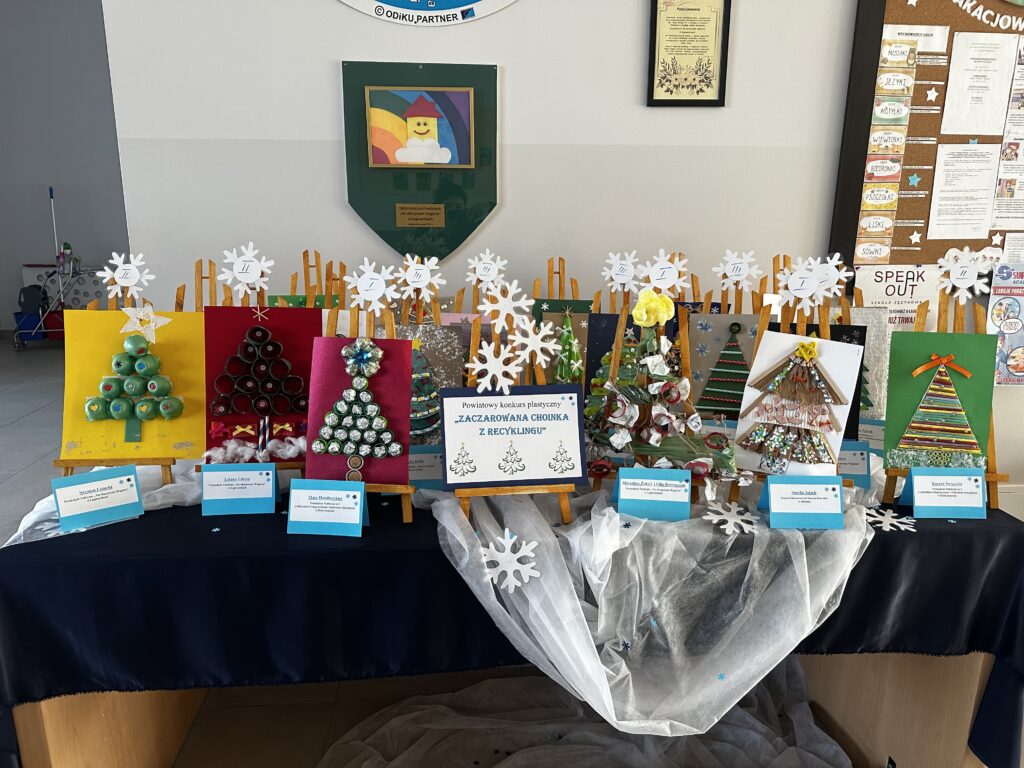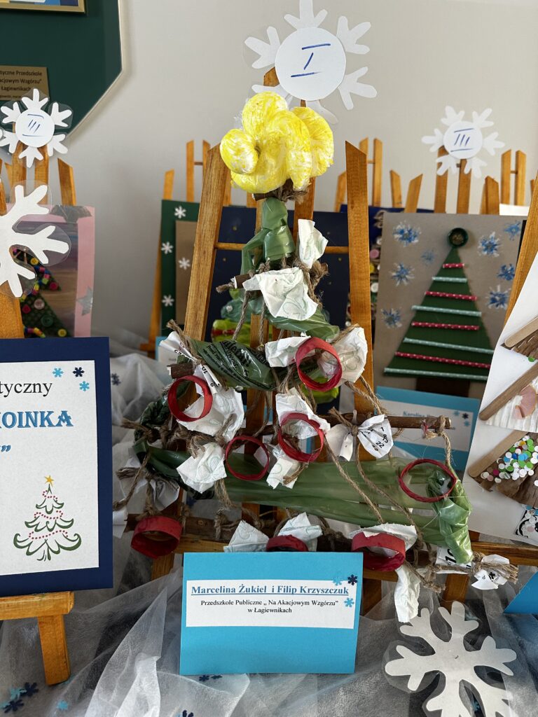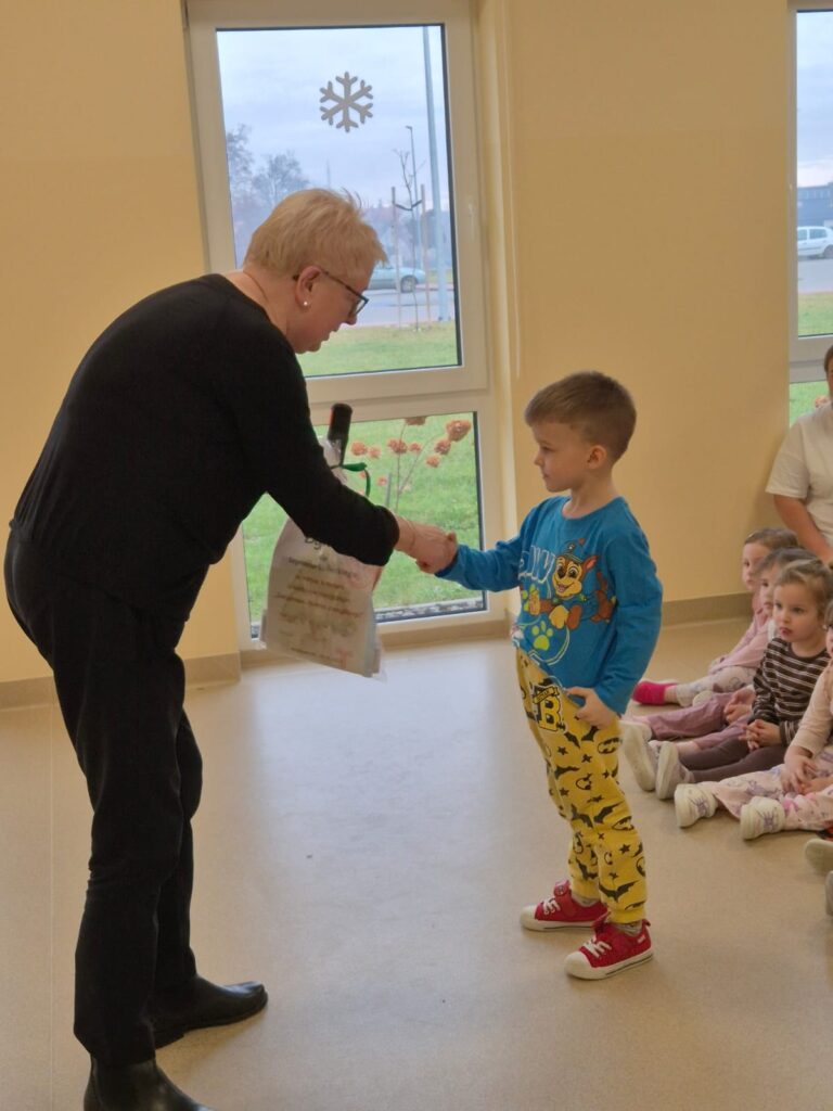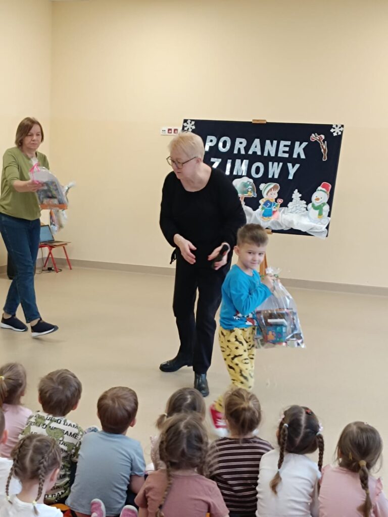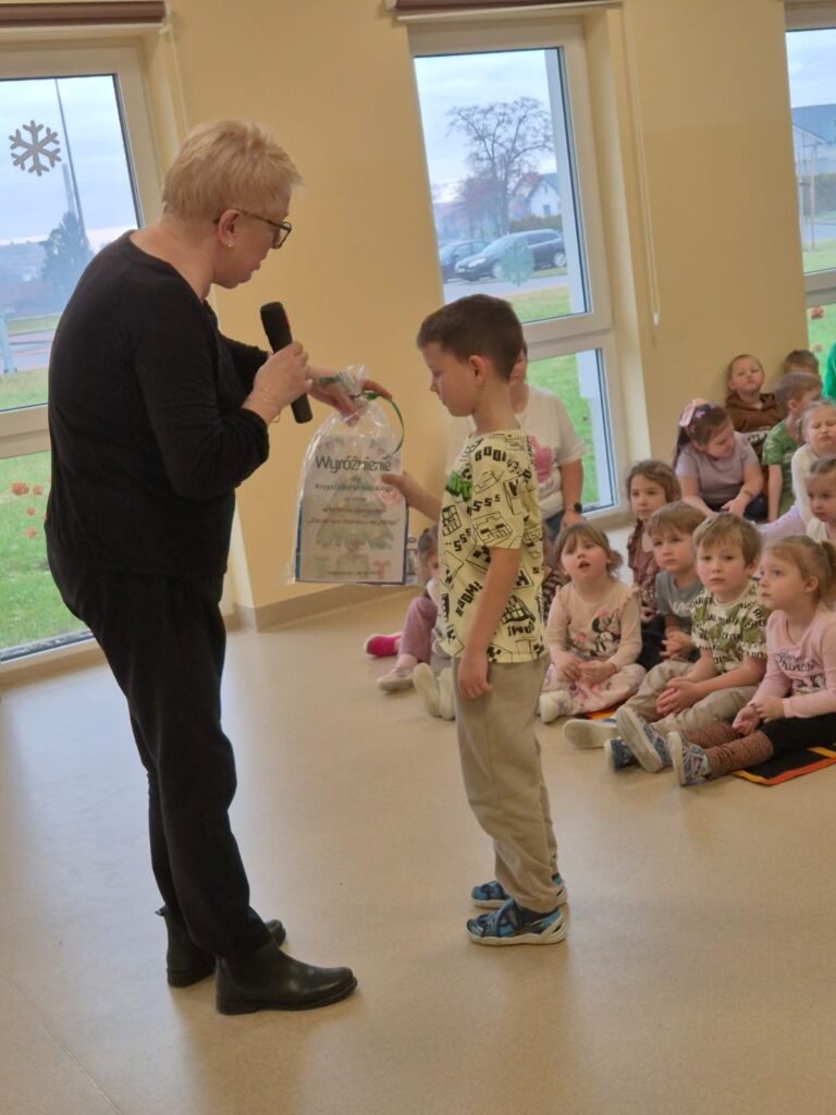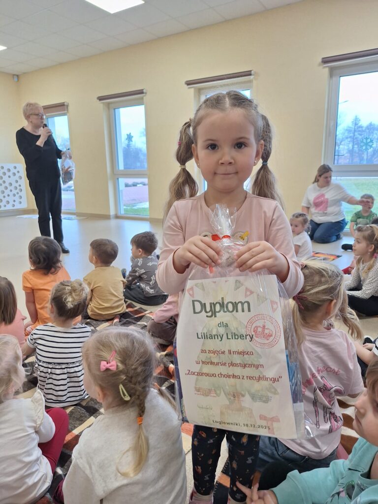 Zwieńczeniem zimowego poranka była miła i uroczysta chwila – Pani Dyrektor Dorota Zarzycka wręczyła dyplomy oraz nagrody dzieciom biorącym udział w konkursie powiatowym „Choinka z recyklingu” organizowanym przez nasze przedszkole. Wystawę prac można oglądać w holu przedszkola.