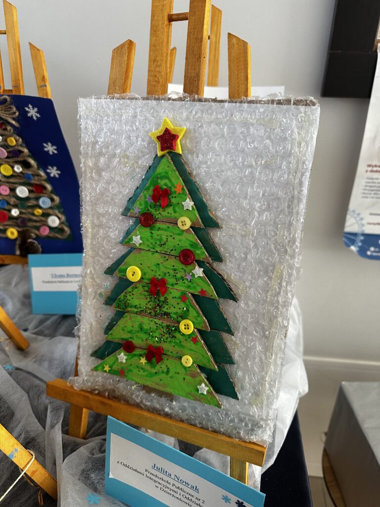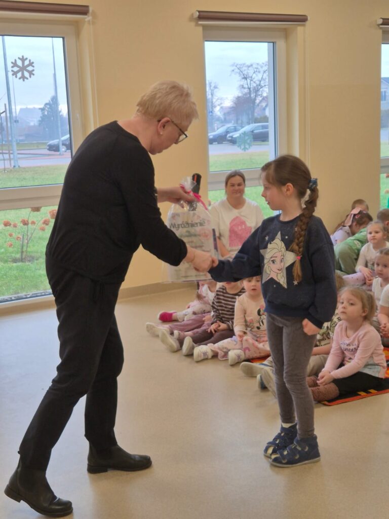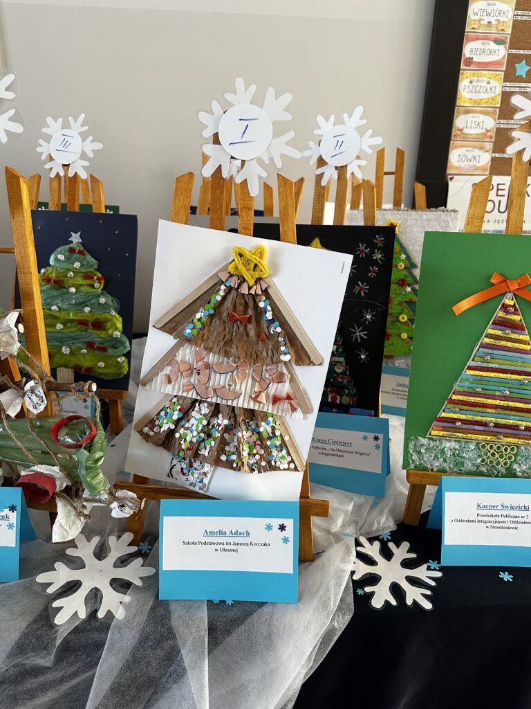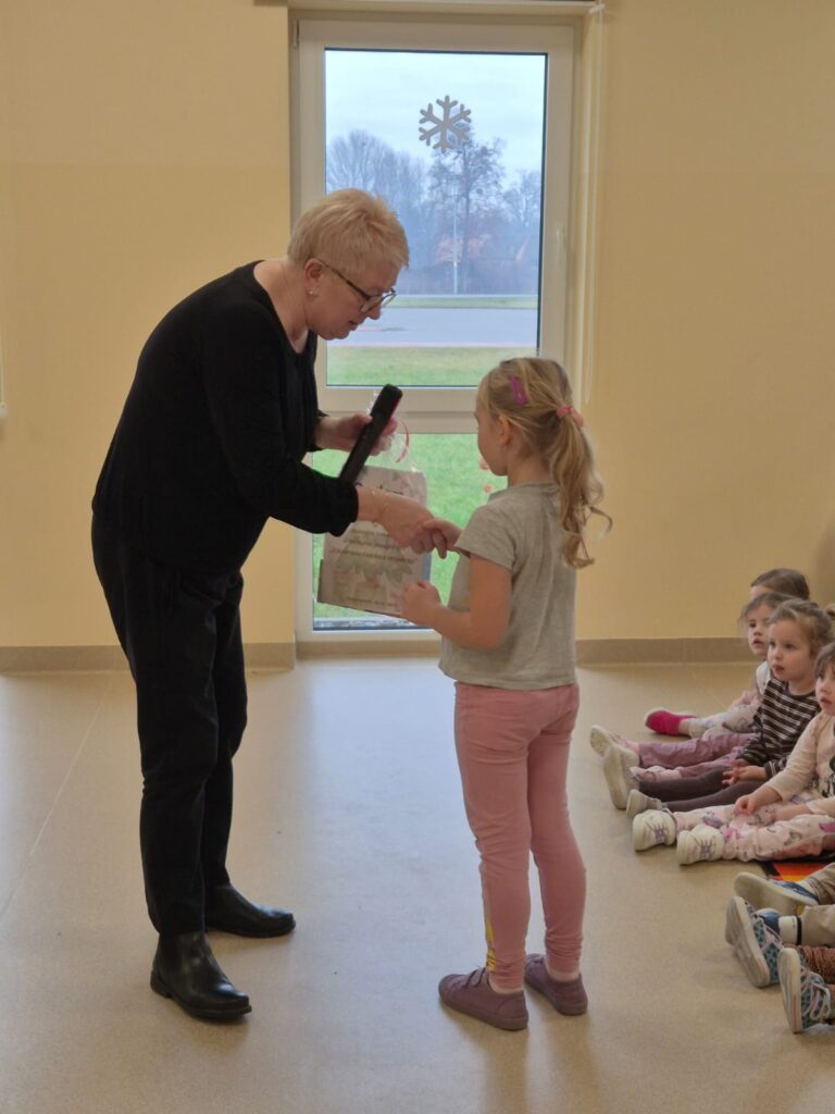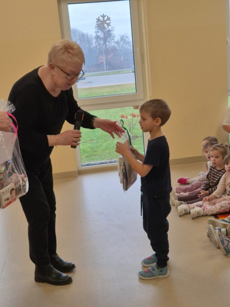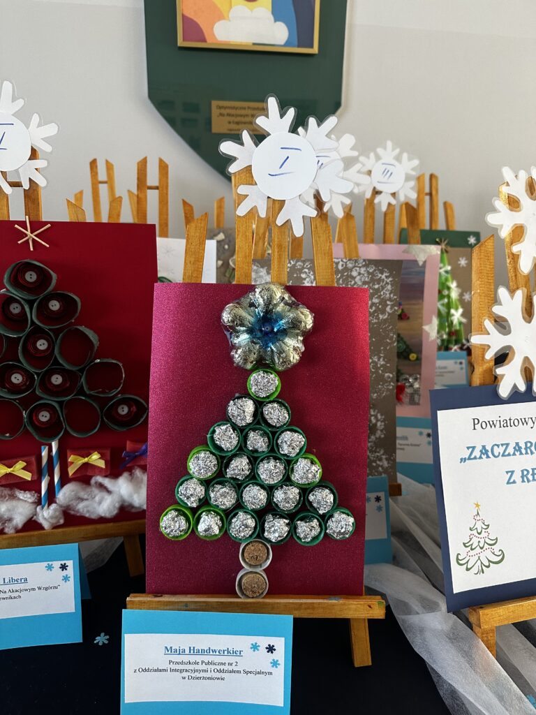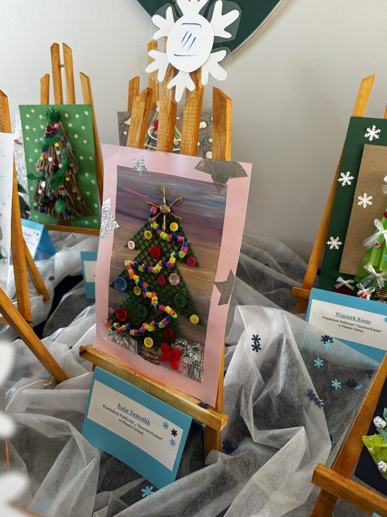 Zwieńczeniem zimowego poranka była miła i uroczysta chwila – Pani Dyrektor Dorota Zarzycka wręczyła dyplomy oraz nagrody dzieciom biorącym udział w konkursie powiatowym „Choinka z recyklingu” organizowanym przez nasze przedszkole. Wystawę prac można oglądać w holu przedszkola.