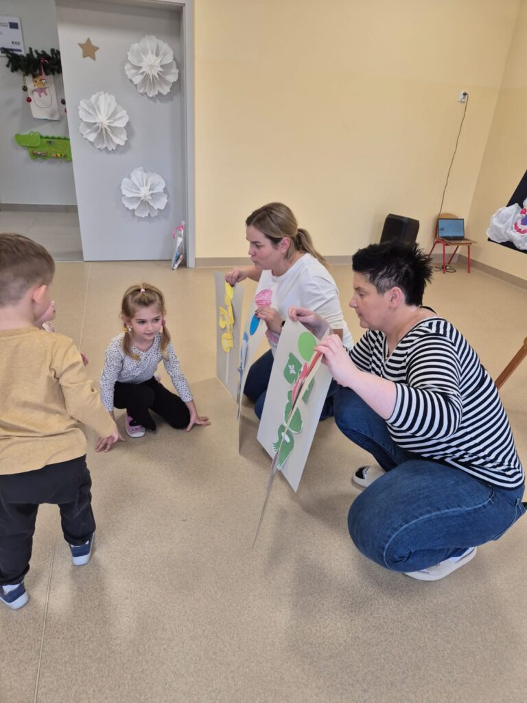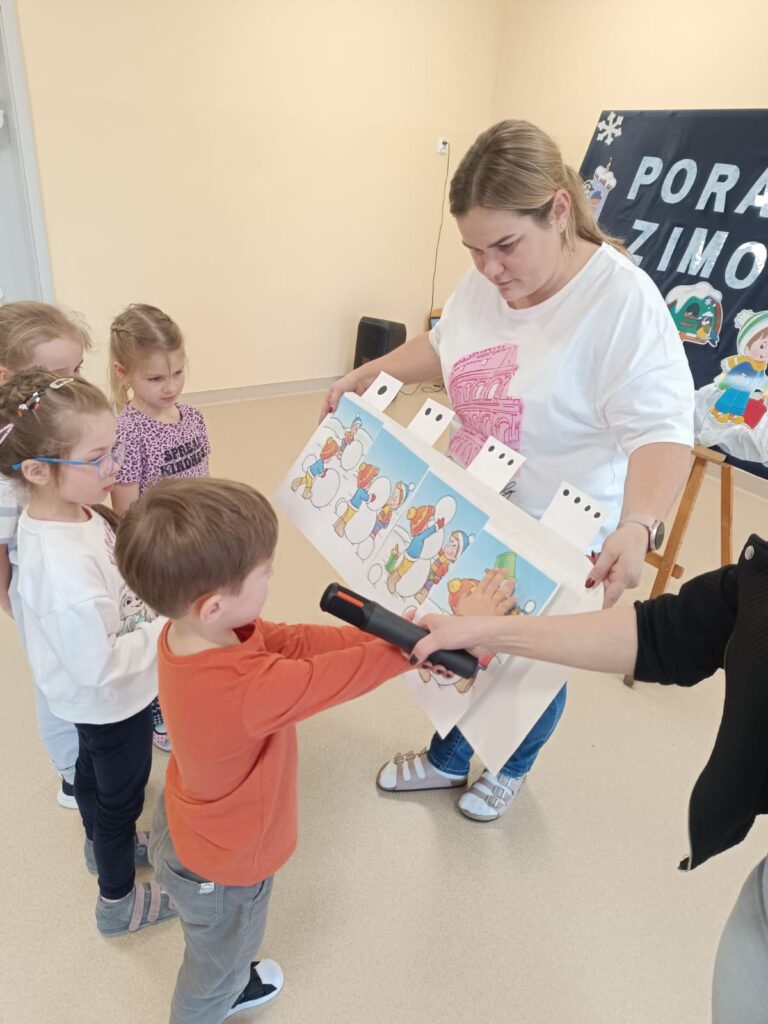 Spotkanie rozpoczęło się od opowiadania logopedycznego o zimie, podczas którego dzieci aktywnie uczestniczyły w ćwiczeniach usprawniających aparat mowy, gdzie naśladowały dźwięki zimowej przyrody.