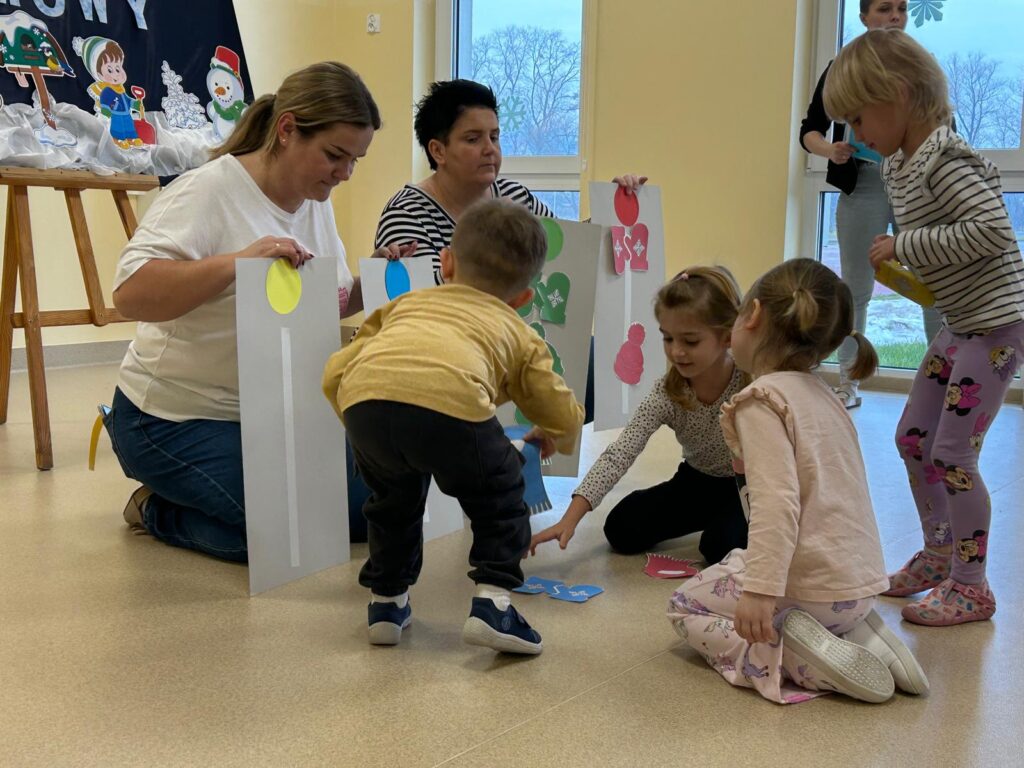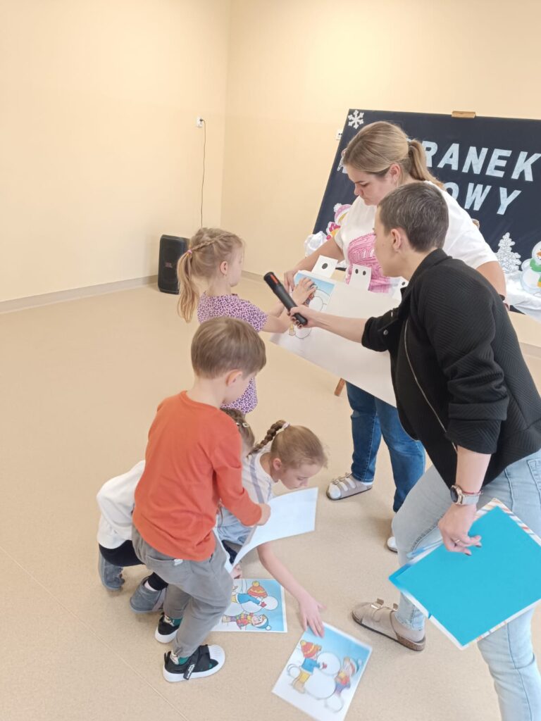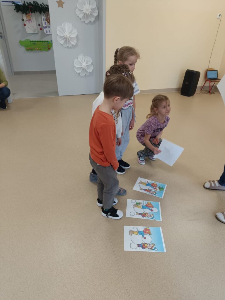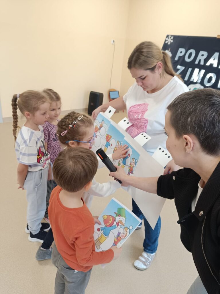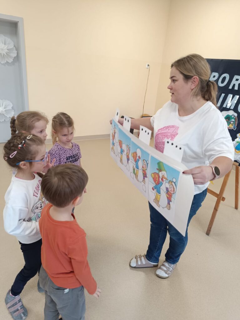 Następnie każda z grup śpiewała zimową piosenkę, które wprowadziły wszystkich w radosny nastrój. Kolejnym punktem były do rozwiązania zadania, gdzie dzieci klasyfikowały czapki, szaliki i rękawiczki, przyporządkowując je do odpowiednich kolorów. Nie zabrakło również aktywności rozwijających wyobraźnię. Dzieci układały historyjkę obrazkową pt. „Jak lepimy bałwana”, porządkując ilustracje we właściwej kolejności i opowiadając, jak krok po kroku on powstaje.
